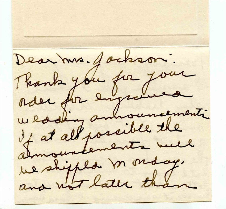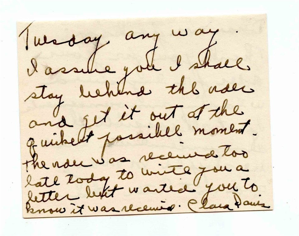 Clara Davis Hand Written Note on Engraved Card Roberts & Son Birmingham AL 1930s
