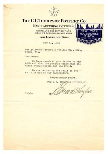 An original single page letter with blank back. Types and signed, has a New York Housewares Show Sticker attached. C C Thompson Pottery Letterhead East Liverpool Ohio 1938