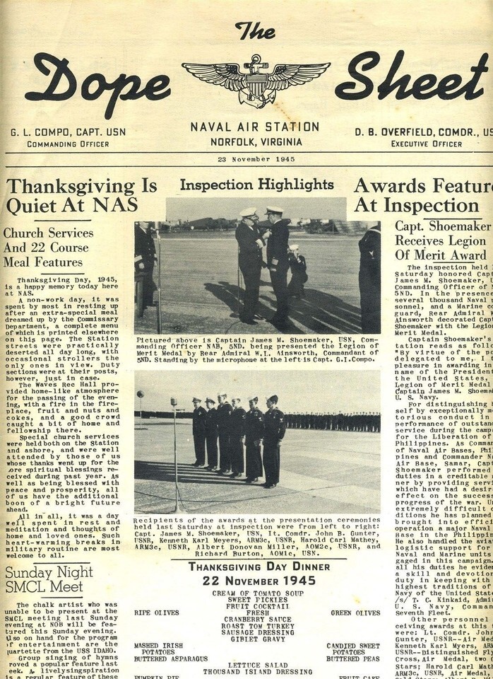 The November 23, 1945 issue of The Dope Sheet, a publication of the Naval Air Station at Norfolk, Virginia. In very good condition with some creases and light age stains. 8 Pages with photos, news, articles and much more. Includes the Thanksgiving Dinner Menu on the front page.