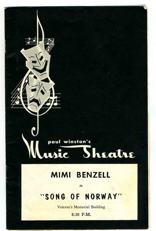A 12 page souvenir program and 16 page performance program in fine condition from a performance of Song of Norway from a Paul Winston's Music Theatre production in 1957 at Dayton and Columbus Ohio. Filled with photos of the production, stars and staff, with many biographies and the history of the production company. From 1957. Starring Mimi Benzel, Lawrence Brooks, Leon Janney and Margot Moser. Also Larry Blyth and Barry Burns.