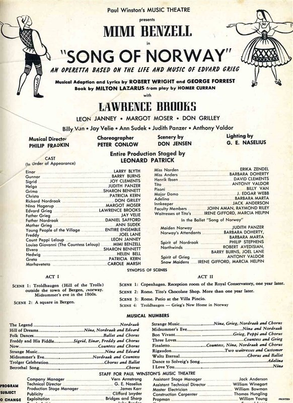 Song of Norway Souvenir Program & Program Paul Winston's 1957 Columbus Ohio