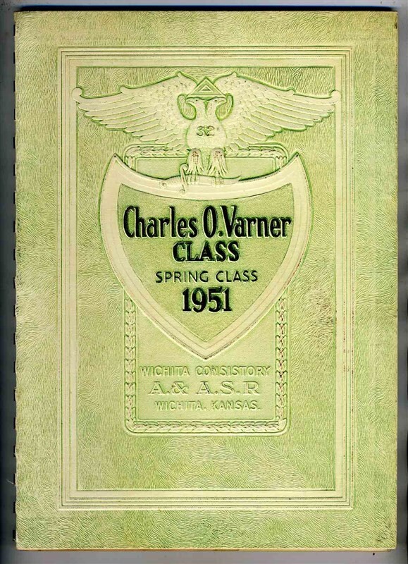 A Charles O Varner Class Spring 1951 Wichita Consistory Ancient and Accepted Scottish Rite , Valley of Wichita, Orient of Kansas plastic bound book. Filed with photos, information, pictures, history, class committee names and information, list of Class Members, and much more. About 64 page. Has a large fold out Class Photo. Has a beautiful embossed cover. Bound into the back of the book are a 24 page Invitation and Spring Reunion Program and a 4 page menu.
