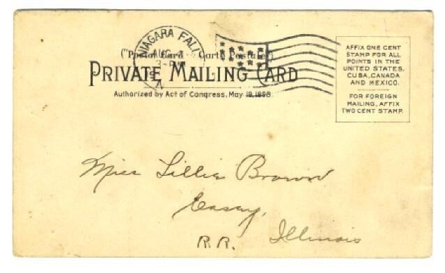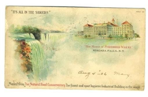 An undivided back Private Mailing Card, postmarked Niagara Falls, New York in 1906. Its all in the shreds, Mailed from the Natural Food Conservatory, the finest and most hygienic Industrial Building in the World. Has smudges.