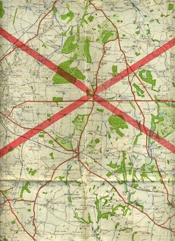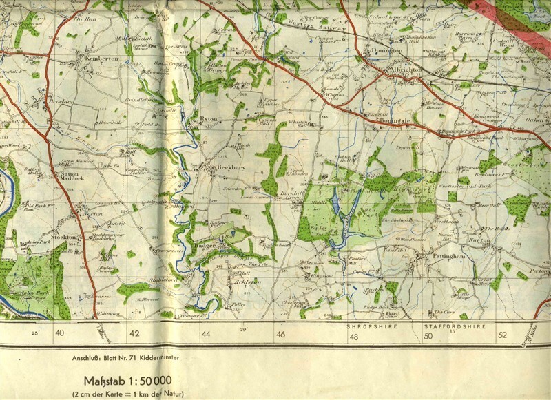 Opens to about 35" x 25". A Mannheim Germany 1943 United States Army Map First Edition U-3. It is printed on the back is a map of an Area of Shropshire and Stafford England with German legend. . This map has a large "X" across the map. The Mannheim map is in English. In very good condition.