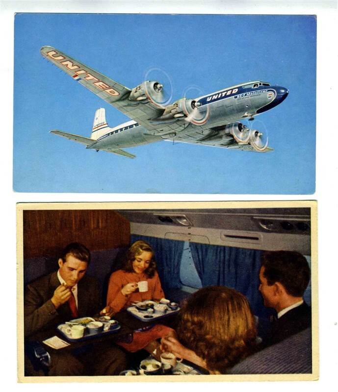 There are 2 different United Airlines postcards in this lot. A United Airlines DC-6 Club Car postcard mailed in 1955 and a DC- 7 inflight unmailed but written on Postcard.