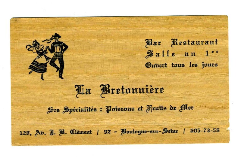 A Wood Business Card from La Bretonniere Restaurant in Boulogne sur Seine France. Measure about 2 1/2" x 4 1/4".
