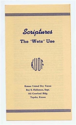 A 4 page brochures used in the 1948 Kansas elections on the legalization of Liquor Stores . Kansas has the strictest liquor laws in the United States and has still not ratified the 21st Amendment which ended nationwide prohibition in 1933. Scriptures the Wets Use. A close look at the references to wines in the Bible. Published by the Kansas United Dry Forces of Topeka,