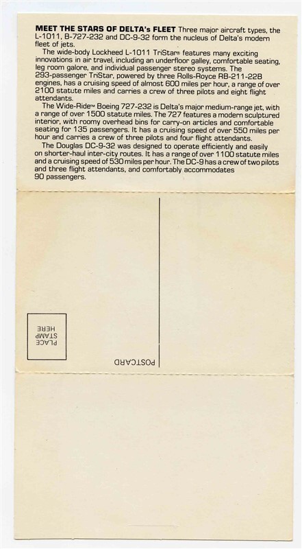 An official Delta Airlines Postcard. Shown are the Lockheed L-1011 TriStar, the Boeing 727-232, and the Douglas DC-9-32. Unused. On this version the 1011 held 293 passengers, the 727 held 135 passengers and the DC-9 held 90 passengers. Has not been mailed