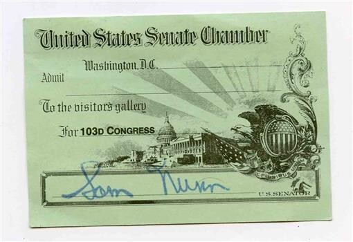 A Pass for admittance to the United States Senate Chamber for the 103rdh, nbsp. This pass is facsimile signed by Senator Sam Nunn of Georgia With pass rules on the back. Measures about 4" x 2 3/4". The 103rd Congress met in Washington, D.C. from January 3, 1993, to January 3, 1995, during the final weeks of George H. W. Bush's presidency and the first two years of Bill Clinton's presidency.