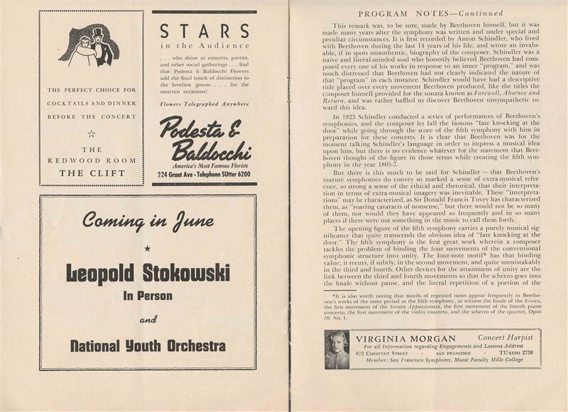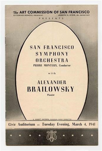 A 16 page program from a performance of the San Francisco Symphony Orchestra on March 4, 1941 of Pianist Alexander Brailowsky . With notice of future performances of Yehudi Menuhin, Leopold Stokowski and Jose Iturbi.