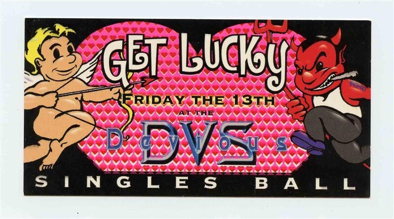 A very colorful 2 sided advertising card, Devious , located on Sunset Strip in West Hollywood California. A Get Lucky Friday 13 Valentine Singles Ball . Measures about 5 3/8" x 2 3/4"