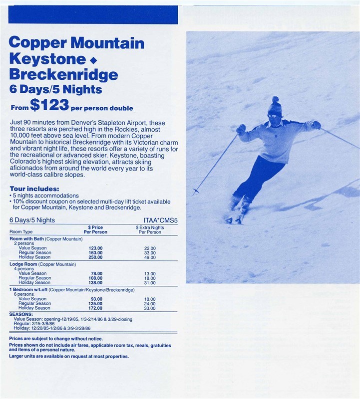 A large illustrated 6 panel fold out brochure with photos, car rental information and tour information for Park City Utah, Lake Tahoe, Copper Mountain, Keystone and Breckenridge Colorado. With prices and sample air fares. American Airlines Ski Brochure 1985/86 Park City Lake Tahoe Copper Mountain . Measures about 7 3/4"x 9 3/4" when closed.
