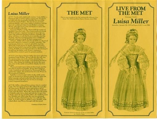 An illustrated 6 panel fold out with photos and information on the Director and Performers. Luisa Miller Live from the Met Program from January 20, 1979 . With Renata Scotto , Jean Kraft , Placido Domingo and Directed by James Levine