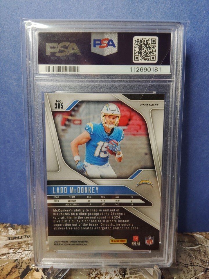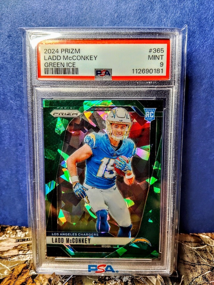 The product is a 2024 Panini Prizm trading card featuring rookie player Ladd McConkey from the Los Angeles Chargers. This specific card is a Green Ice Prizm parallel variety, part of the base set for the 2024 season. With a PSA 9 mint grade, this collectible is a valuable addition to any sports trading card collection, especially for fans of the National Football League (NFL) and football memorabilia enthusiasts.