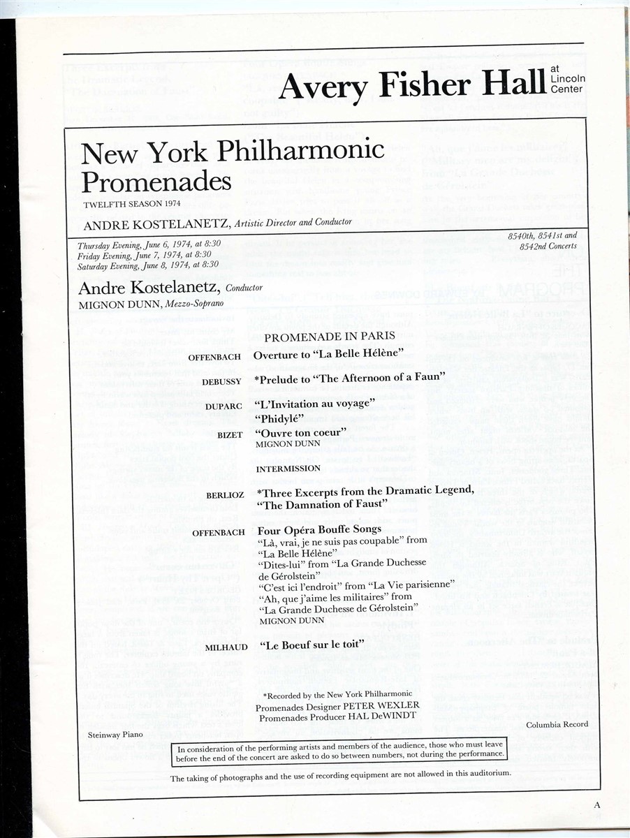 A program from Avery Fisher Hall at Lincoln Center in New York City. New York Philharmonic Promenades Program, Andre Kostelanetz , Artistic Director and Conductor. From a June 1974 performance in Lincoln Center