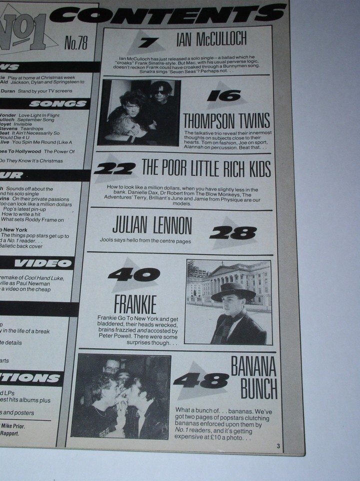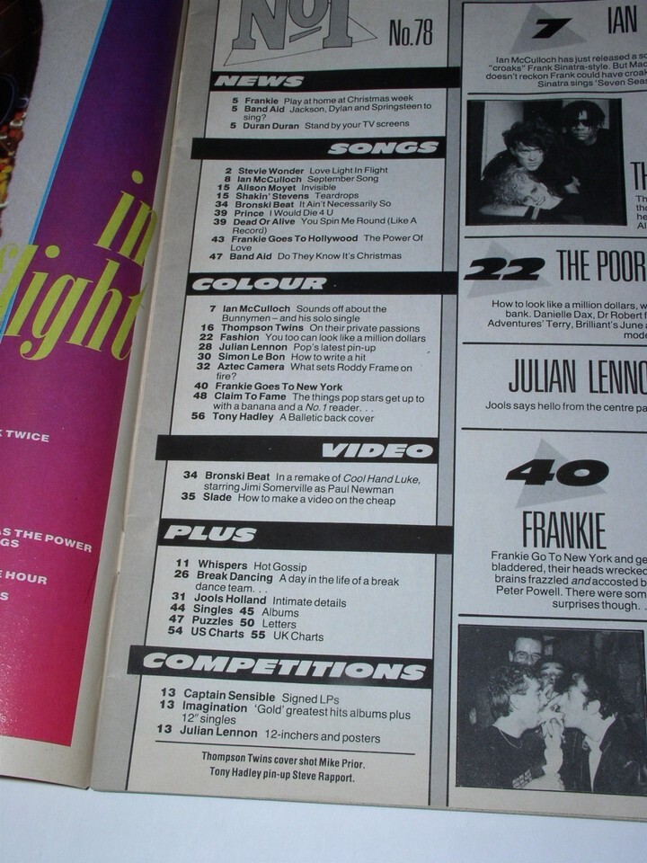 This is the December 8, 1984 issue of "No 1" magazine (UK). Cover story on the Thompson Twins. Inside: Ian McCulloch, The Poor Little Rich Kids, Julian Lennon, Frankie Goes To Hollywood. Centerfold: Julian Lennon. A terrific item for the fan or collector.