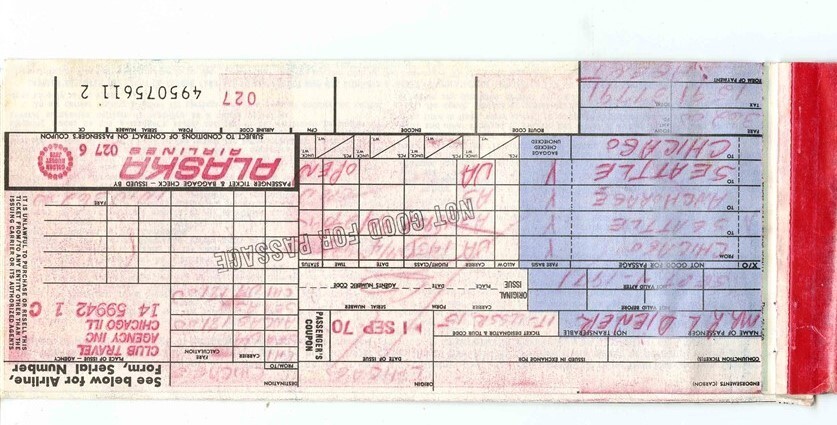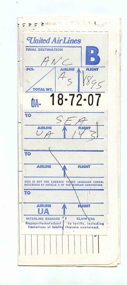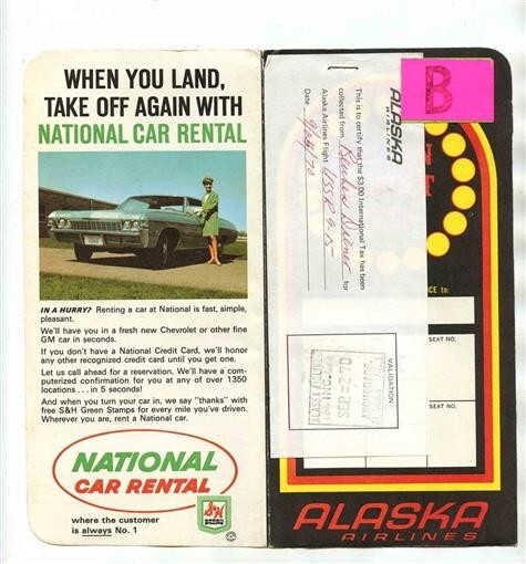 An interesting Ticket JAcket with stapled on stamped sheet to indicate International Tax has been paid. An Alaska Airlines Golden Nugget Jets Ticket Jacket , containing a Round Trip Ticket and 2 stapled on United Airlines Baggage Checks on a Chicago Motor Club Form. . Dated 1970