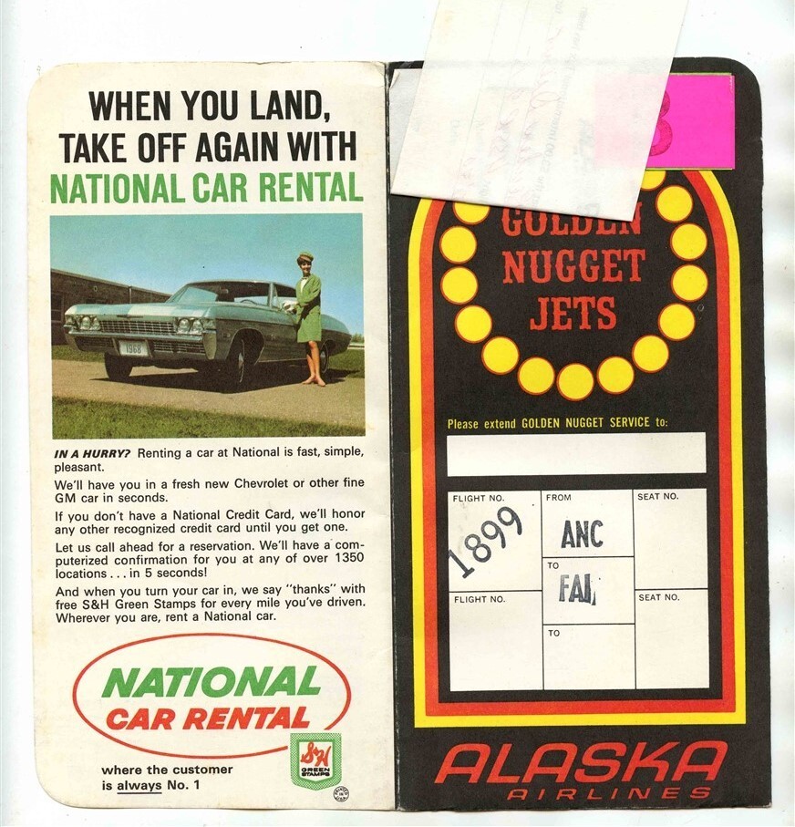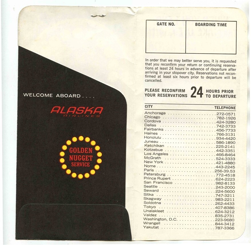 Alaska Airlines Golden Nugget Jets Ticket Jacket Ticket Baggage Check 1970