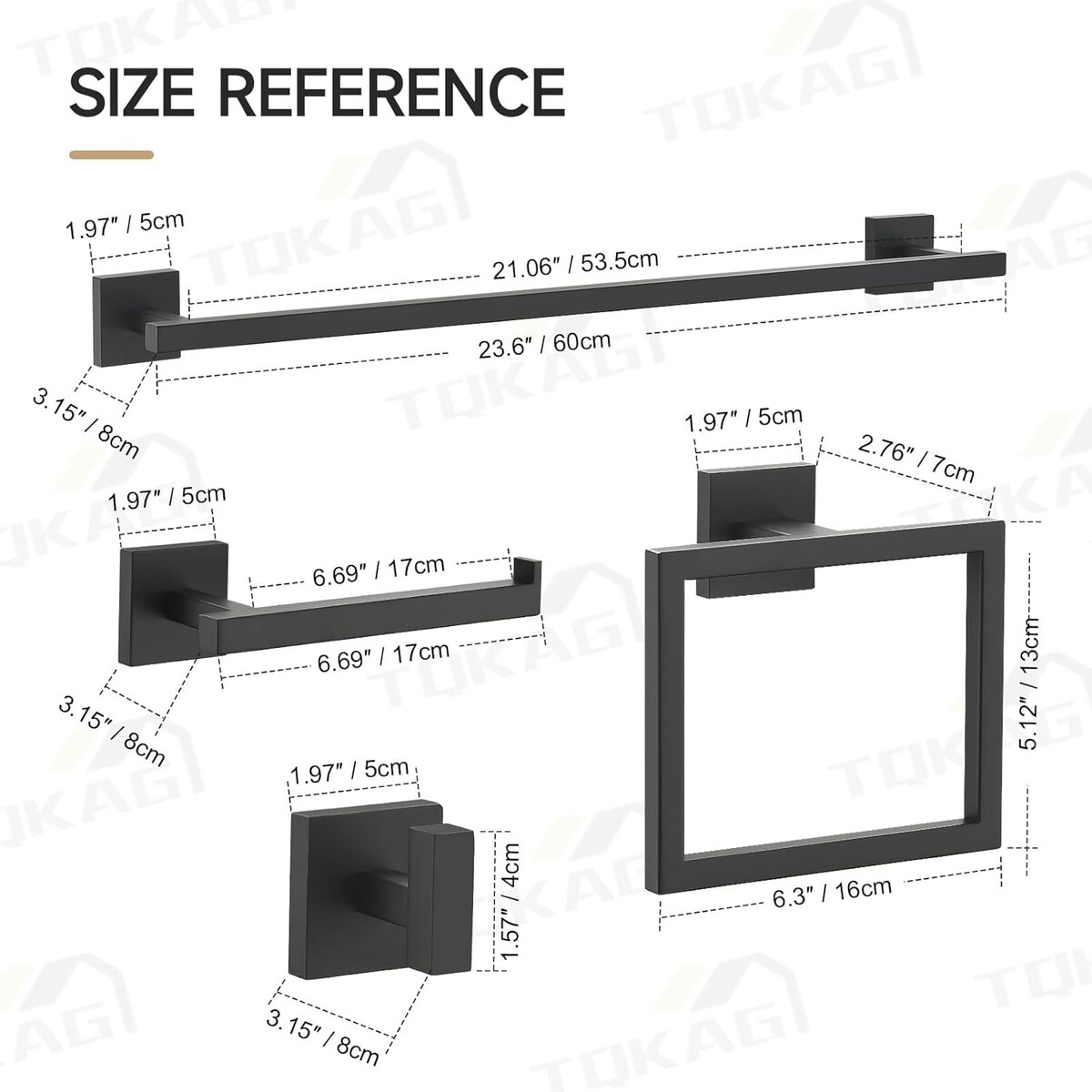5 Pieces Bathroom Hardware Set?- 1 x towel bar(23.6-Inch), 1 x towel ring, 1 x Toilet Paper Holder, 2 x coat hook, screw hardware pack(for screw-mount), and installation instructions. we give you a preferential combination to meet your needs.