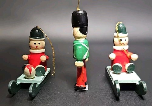 Vintage Lot of 3 Wooden Toy Soldiers Sleds Christmas Ornaments Hand Painted