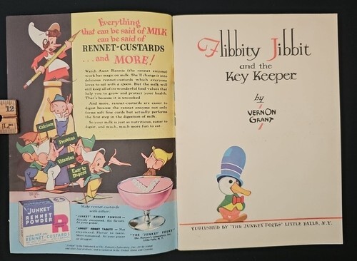 Flibbity Jibbit, a promotional kids book that told the tale of a key-keeper, a king, and a little bird named Flibbity Jibbit. Their journey to find the key to unlock the door that held Junket's Rennet Powder for the king's custard party is told by Grant in an illustrated 32 page fairy tale.