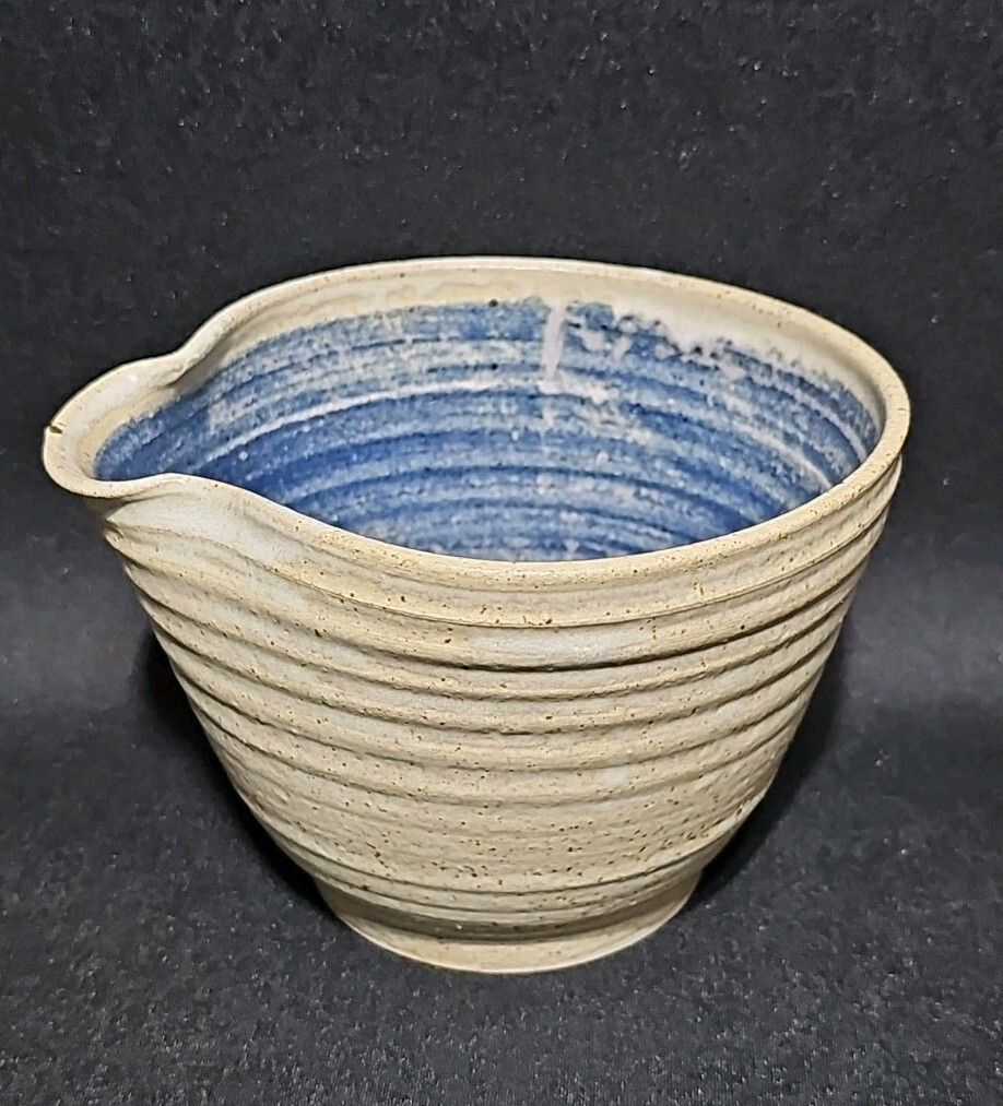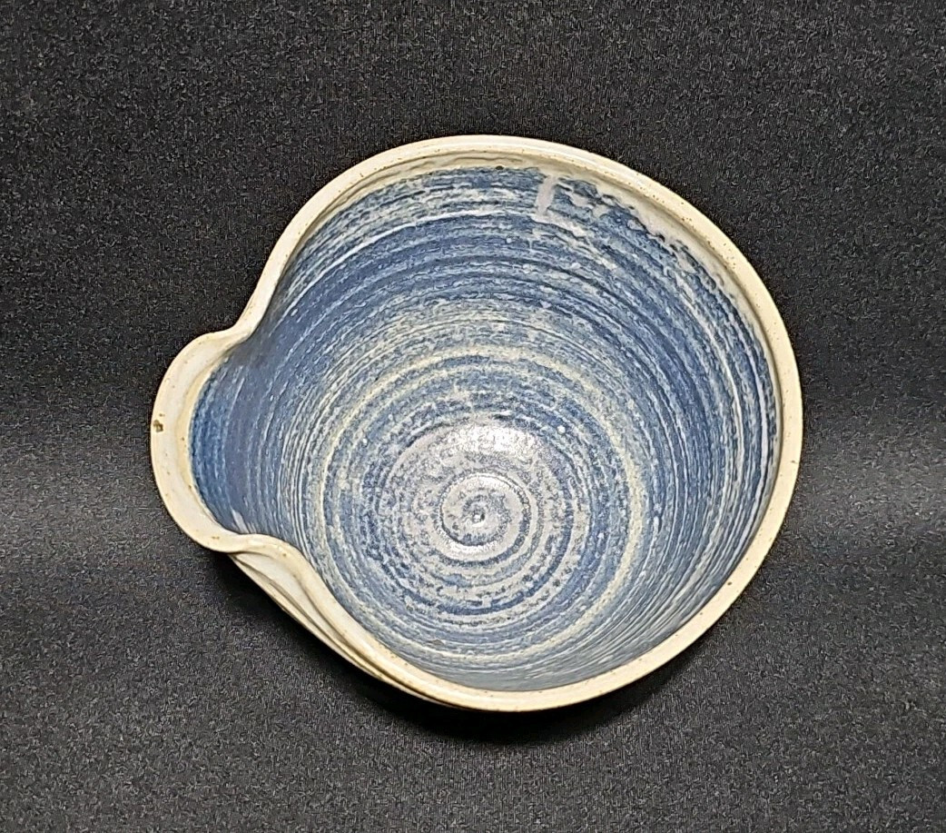 Add a touch of rustic charm to your kitchen with this handmade spouted mixing bowl from Old Mile Pottery Studio. Featuring a beautiful blue and tan glaze, this functional and decorative piece is perfect for mixing batter, pouring sauces, or serving. The textured exterior and spiral interior add to its artisanal appeal, making it a unique addition to any pottery collection.