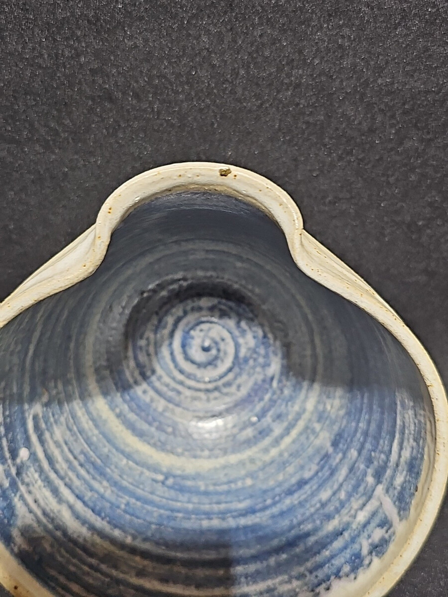 Textured tan exterior with a spiral blue interior glaze