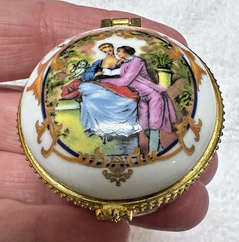 Vintage Porcelain Pill Trinket Box Man Woman in Garden 1 3/4 Wide 1" Tall