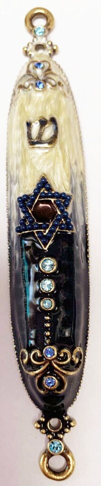 NEW JUUDAICA JEWELED MEZUZAH DARK BLUE AND CREAM 4"