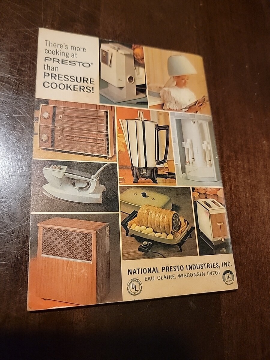 The Presto Pressure Cooker Instruction and Cooking Time Tables Recipe Book from 1971 is a vintage cookbook published by National Presto Industries. This nonfiction book is intended for adult use and features recipes and instructions for pressure cooking. With 64 illustrated pages, this paperback book measures 6 1/2" in length and 4 3/4" in width, making it a valuable resource for cooking enthusiasts looking to explore the world of pressure cooking.