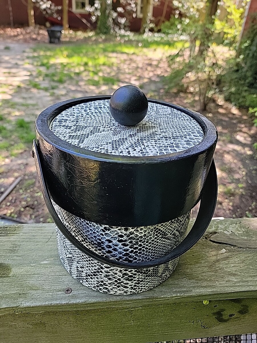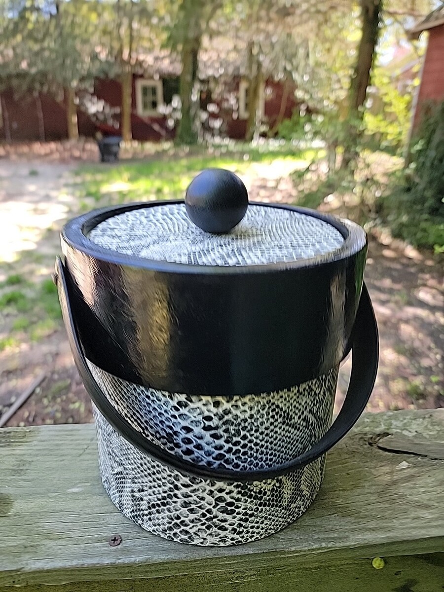 This vintage ice bucket is a stylish addition to any barware collection. The black and white snakeskin design is eye-catching and perfect for those who appreciate the 1960s aesthetic. Made from durable vinyl, it is both lightweight and sturdy, making it easy to carry and store. The bucket comes with a lid to keep your ice frozen and protected from outside elements. Its original design and quality craftsmanship make it a great collector's item or a unique gift for any occasion.