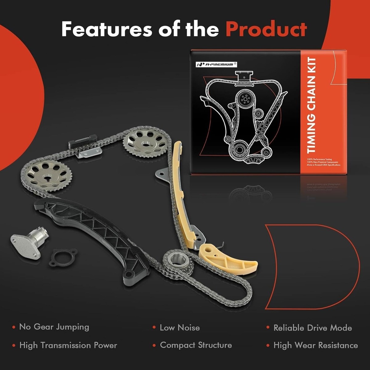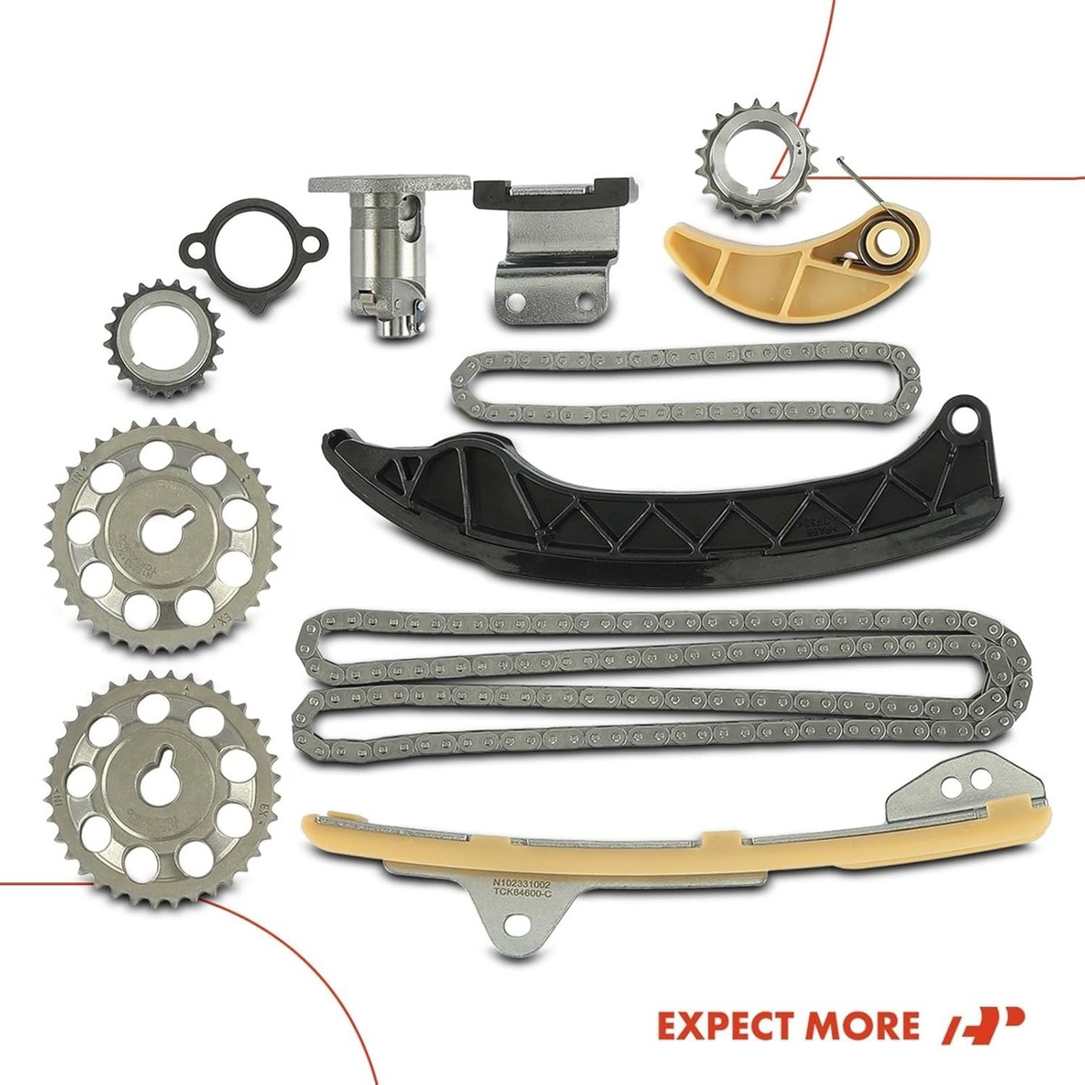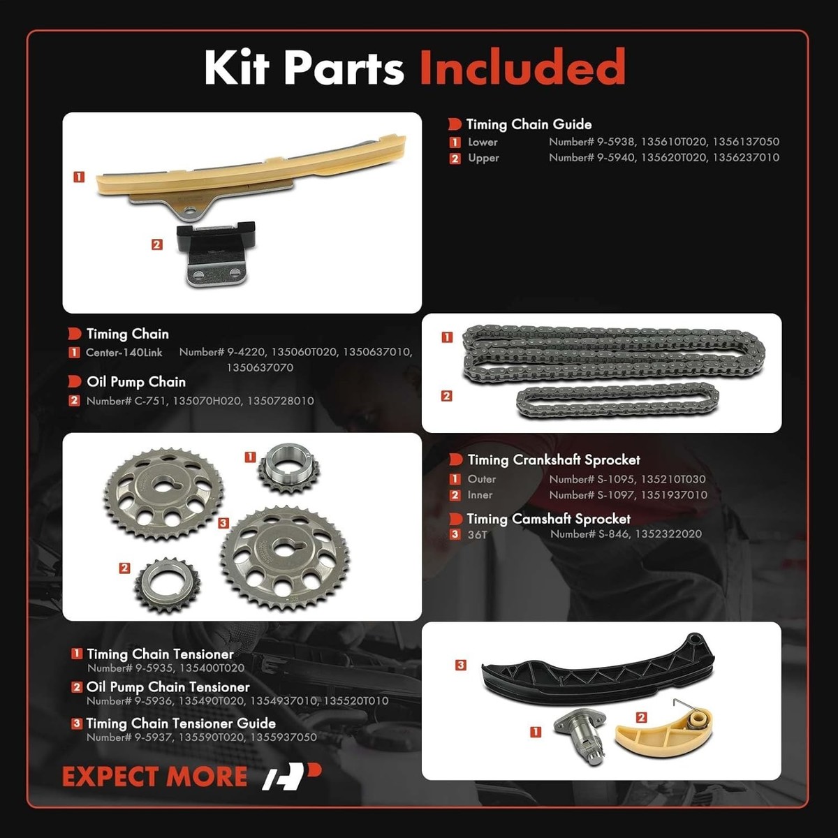 [Kit Contents]: ?Center-140Link Timing Chain [9-4220]; ?Oil Pump Chain [C-751]; ?Timing Chain Tensioner [9-5935]; ?Oil Pump Chain Tensioner [9-5936]; ?Timing Chain Tensioner Guide [9-5937, 9-5938]; ?2PCS Lower Upper Timing Chain Guide; ?Outer Inner Timing Crankshaft Sprocket [S-1095, S-1097]; ?2PCS 36T Timing Camshaft Sprocket [S-846]