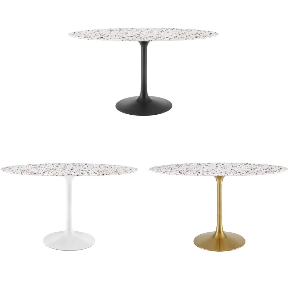 60” Oval White Terrazzo Tulip Dining Table w/ Black, Gold or White Pedestal Stem
