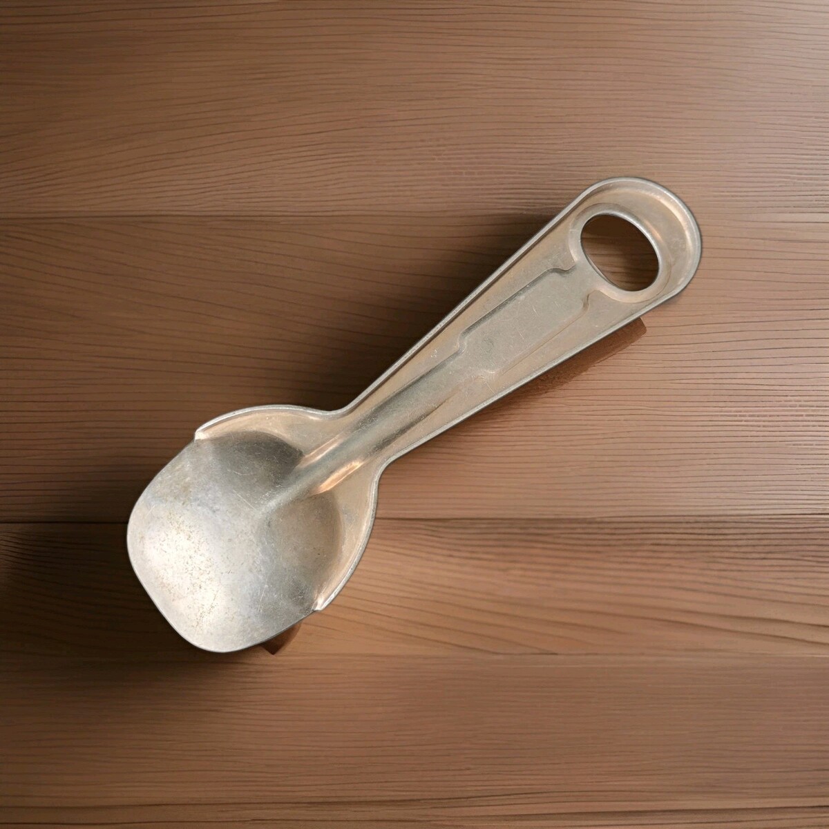 This vintage aluminum shortening and ice cream spoon is a charming addition to any kitchen, farmhouse or cabin kitchen decor. The small silver spoon features a classic shape perfect for all occasions. Made of durable aluminum, this original piece is a unique collectible item for those who appreciate vintage kitchen tools and gadgets. With a length of less than 10 inches, this spoon is a functional and decorative piece that adds a touch of nostalgia to any kitchen setting.