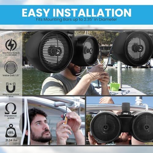Upgrade your outdoor audio experience with the Pyle Dual Waterproof Off-Road Speaker System. Designed for cars, ATVs, UTVs, Jeeps, boats, and other outdoor vehicles, this high-powered system delivers crystal-clear sound with an impressive 300-watt peak output. The 8-inch two-way speakers feature a bullet-style design with a 20 oz magnet structure, dual 1? polymer dome tweeters, and long-excursion woofers with butyl rubber surround for a full-range stereo experience. Built to withstand extreme weather conditions, the marine-grade IP-44 waterproof housing ensures durability, while the corrosion-resistant protective grill cover keeps your speakers safe. The universal mounting system allows for easy installation on support bars, frames, or roll cages up to 2.35? in diameter.