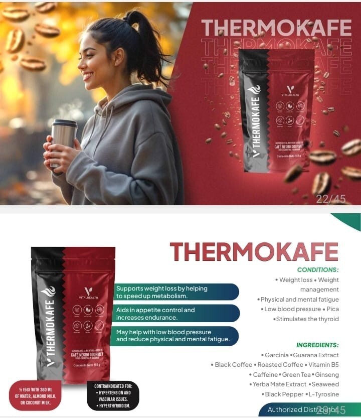 Thermokafe VitalHealth is a Nutrition supplement designed for general wellness, weight management, and weight loss. It contains active ingredients such as Yerba mate leaf, Garcinia Cambogia fruit extract, Organic Cayenne Pepper, Guarana extract, Organic Ginger extract, and Panax Ginseng root. The formulation is in a powder form, providing 50 servings in a 5.30 oz container. The supplement can be taken in the morning or afternoon, with an expiration date of 2026, making it a reliable choice for those looking to improve their overall health and well-being.