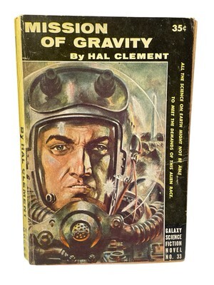 Vintage paperback copy of Mission of Gravity by Hal Clement, published as Galaxy Science Fiction Novel No. 33. This 1950s science fiction classic is a landmark in hard science fiction, renowned for its rigorous worldbuilding and imaginative storytelling.