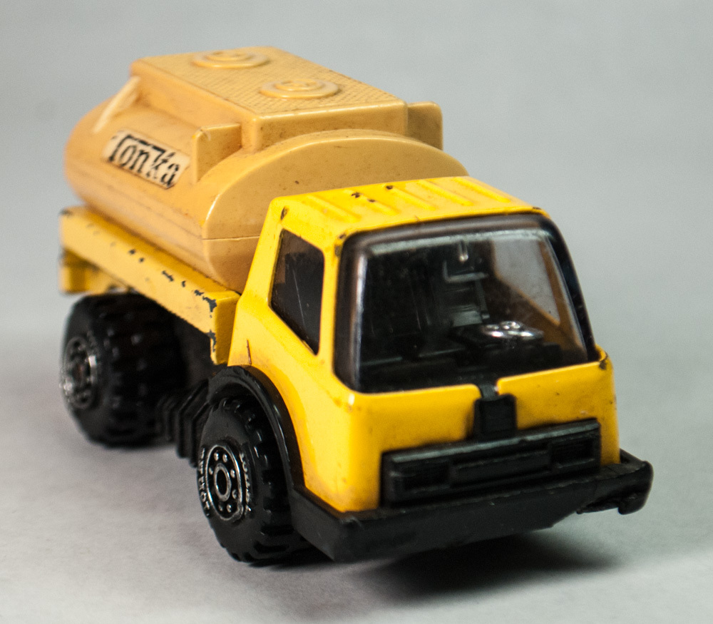 Tonka Mites diecast and plastic yellow fuel tanker truck, No. 150, circa 1978. This vehicle has been played with. The driver side front wheel has a chip out of it, yet vehicle still rolls freely.