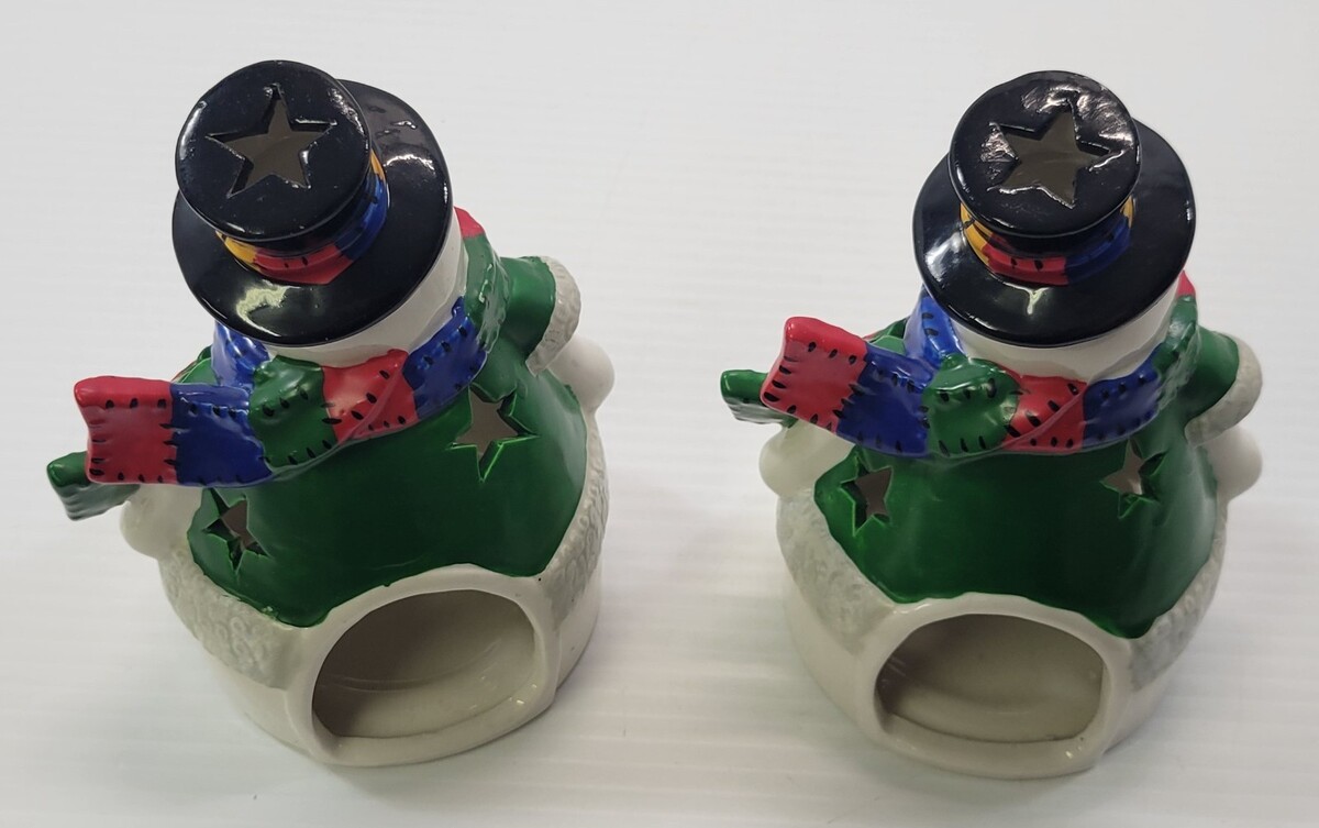 P) Vintage Set of 2 Ceramic Christmas Snowman Tea Light Candle Holders