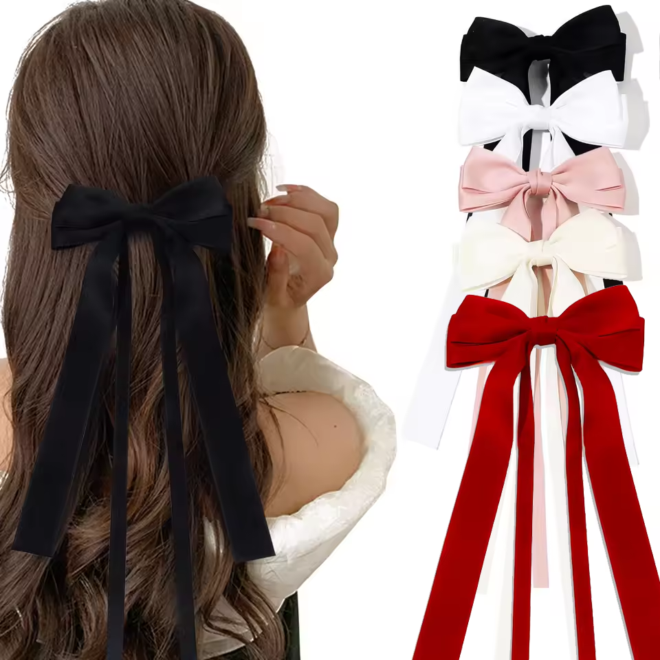 ribbon double bow hair clip, bowknot hair clip, solid color bow barrette, big bow hair clip, long tassel hair clip, tassel bow barrette, silver tone barrette, hair barrette pin, trendy bow hair accessory, korean style hair clip, lightweight hair clip, non slip hair clip, secure hold barrette, for thick hair, for long hair styling, easy half up hairstyle, no crease hair clip, comfortable all day wear, party hair accessory, wedding guest hair clip, birthday gift for girls, holiday gift for women, everyday bow hair clip, school hair accessory