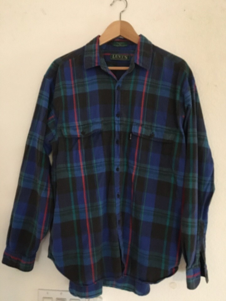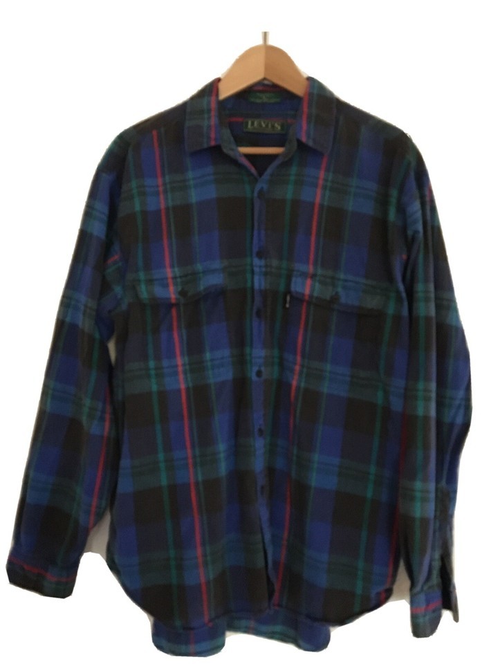 Vintage LEVIS BIG E Flannel Shirt L Plaid Blue Red Green Button Up Sutter Creek
