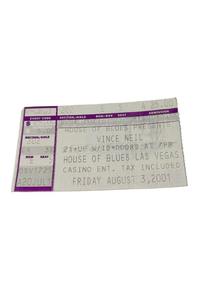 Vince Neil of Motley Crue House Of Blues Vegas Ticket Stub Row E Seat 5 08/03/01