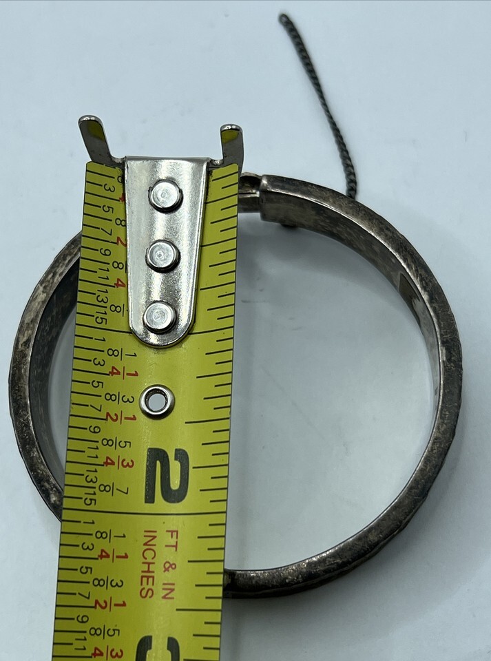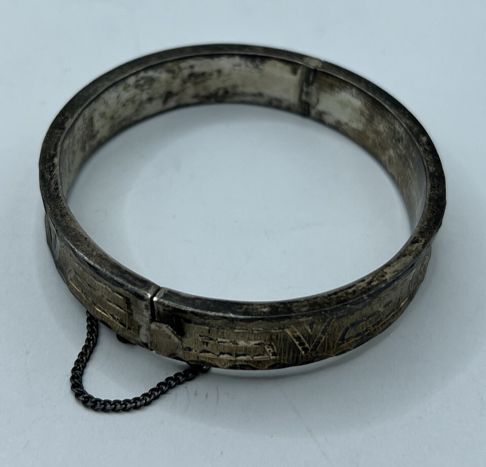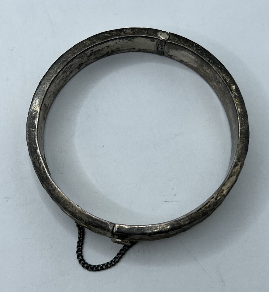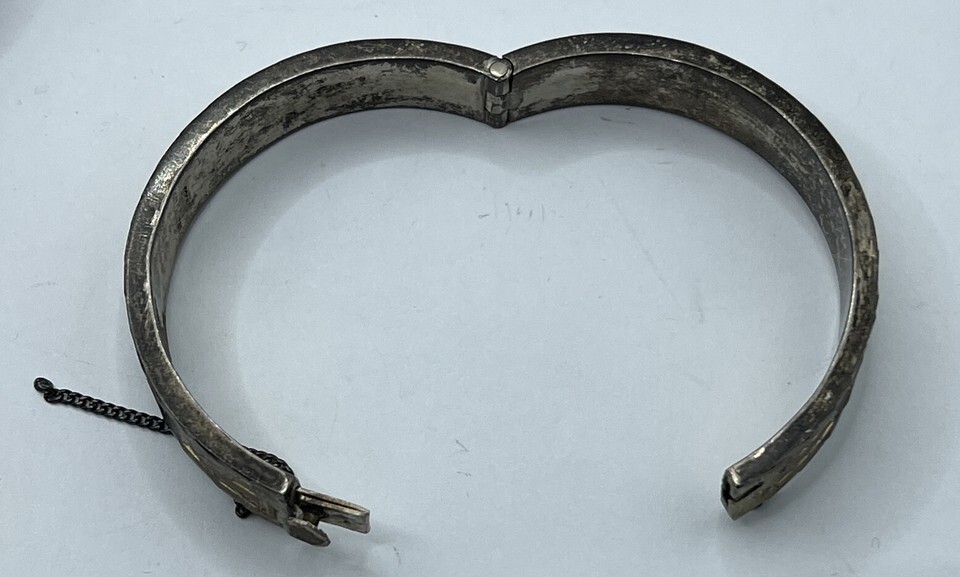 Gorgeous sterling silver bracelet. This is signed as being made in Guadalajara Mexico out of sterling 925. The clasp is fully functional but the safety chain is broken (and could be repaired by a jeweler with proper tools easily). The cuff fits up to a 4.5 inch wrist comfortably, 4.8 inch wrist if you remove the safety clasp entirely.