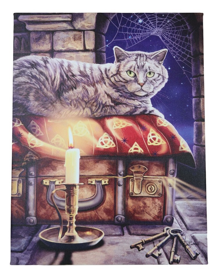 Ebros Wicca The Keeper of Secrets Cat by Candle And Keys Wood Framed Canvas Wall Decor