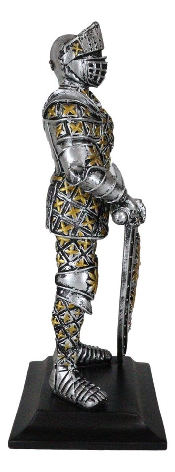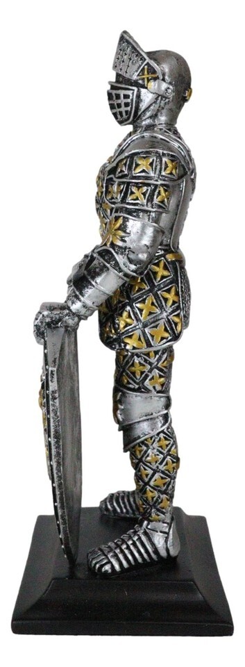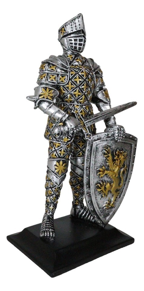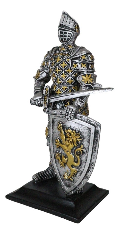 ? Decorate your home with this gorgeous chivalrous knight statue. He is fully armored, standing on guard with a long sword and large heraldry lion emblem shield. He will make a great gift to any medieval knight, crusader knights and renaissance art lovers.
