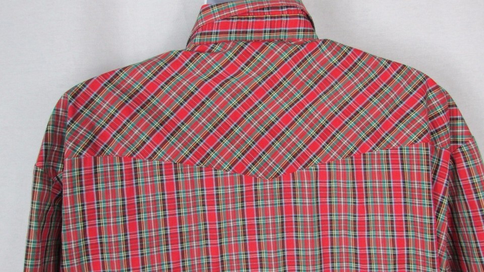 Poly Cotton plaid shirt snap down has chest pockets and is clean and free of flaws, but will need to be ironed.