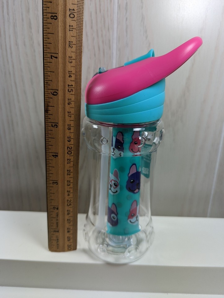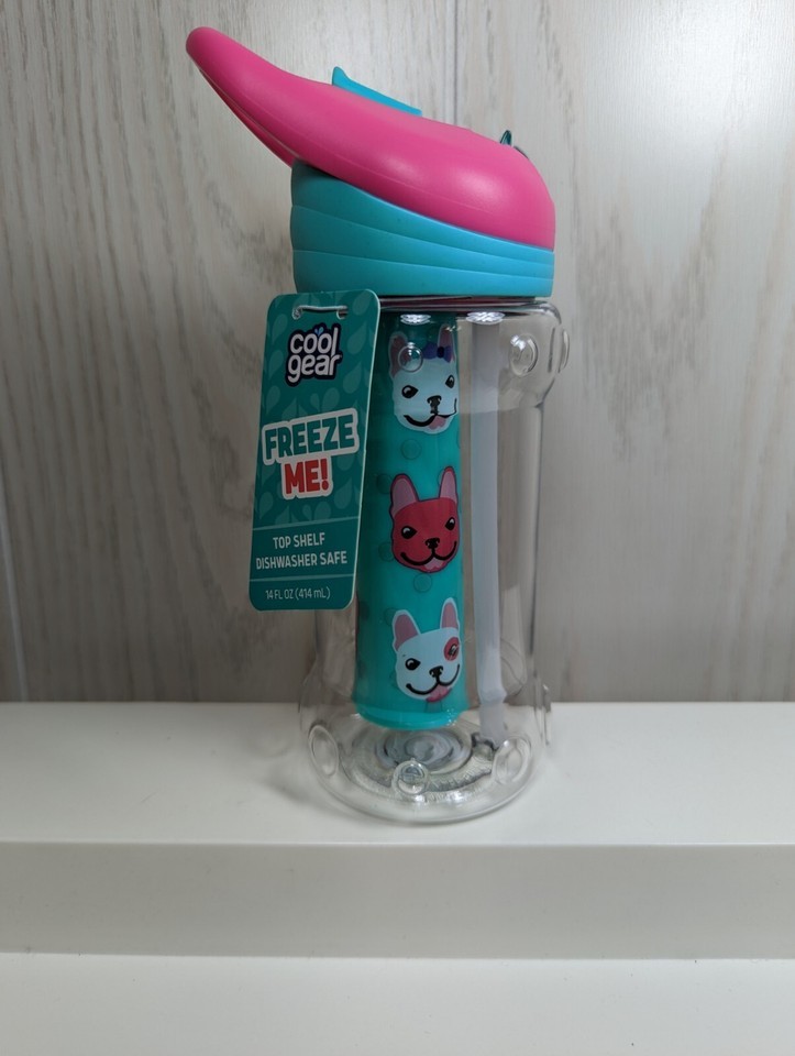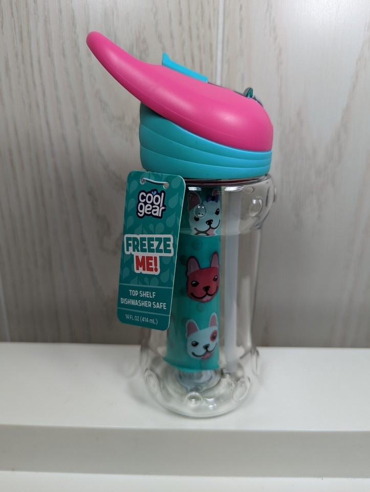 Cool Gear Freeze Me kids water bottle freezer stick straw pink teal puppy 14 oz