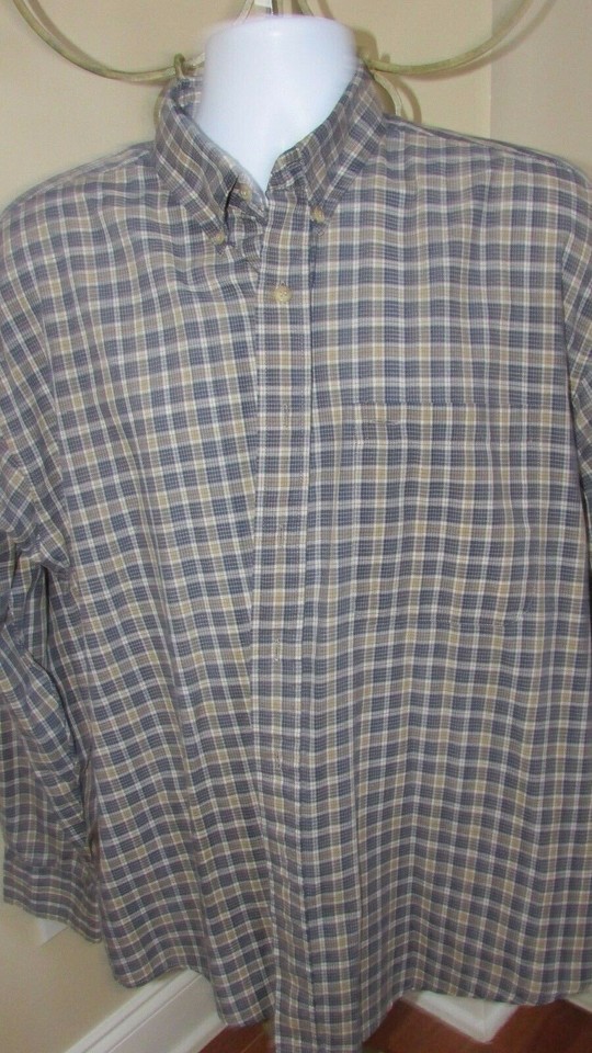 Mens XL Haggar blue tan plaid cotton poly button down casual shirt