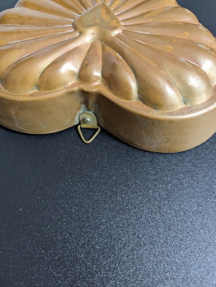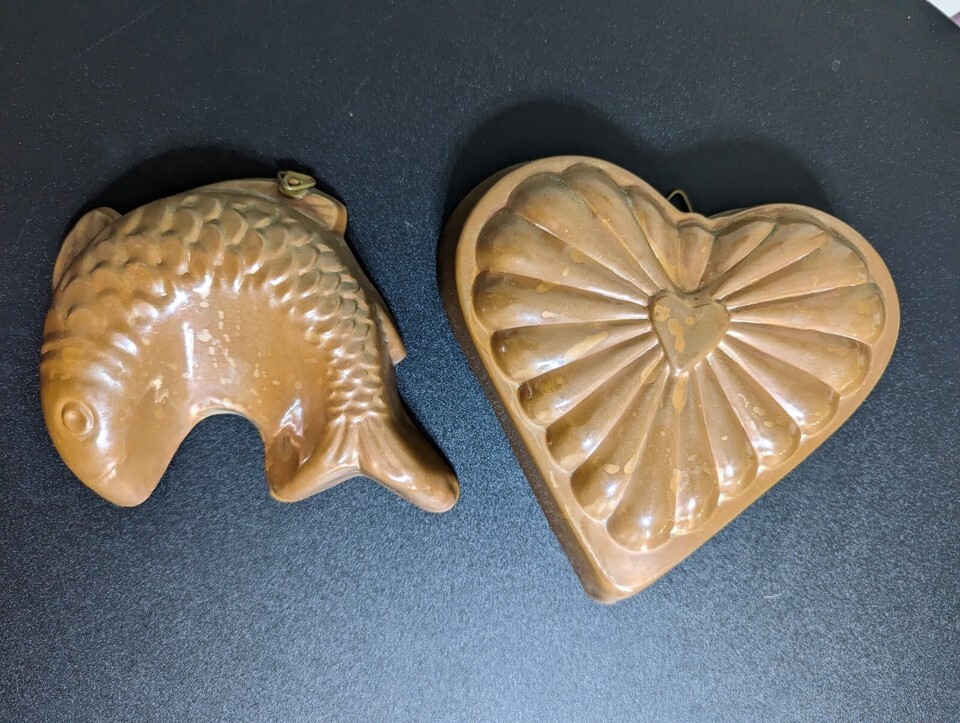 Copper tin lined Fish Heart Jello Mold Lot Pan Brass Ring hanging Korea vintage