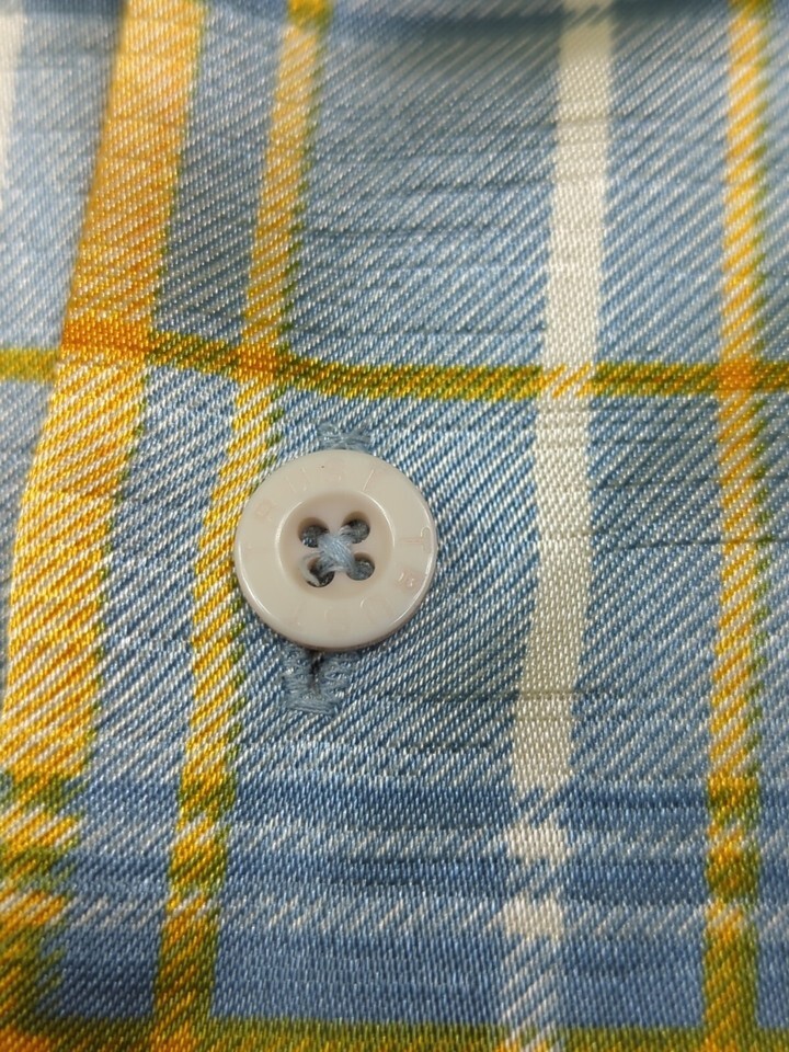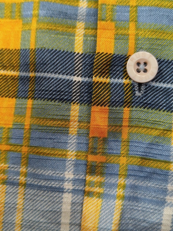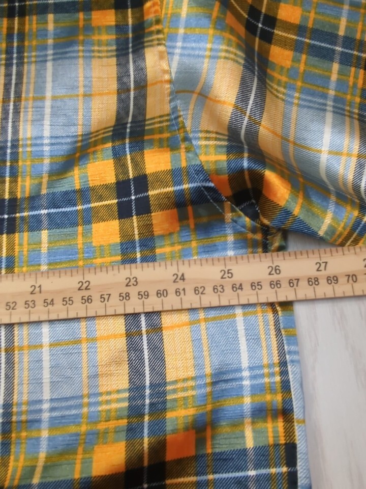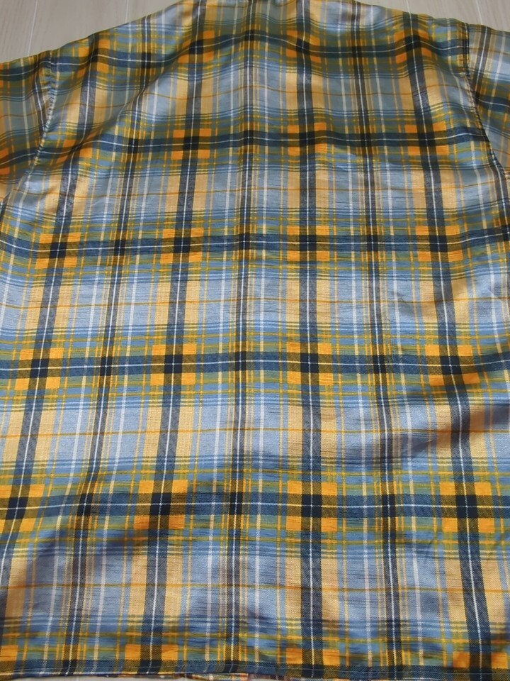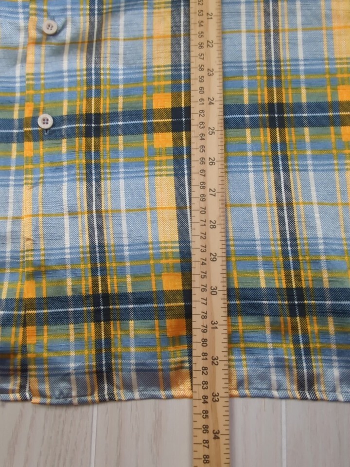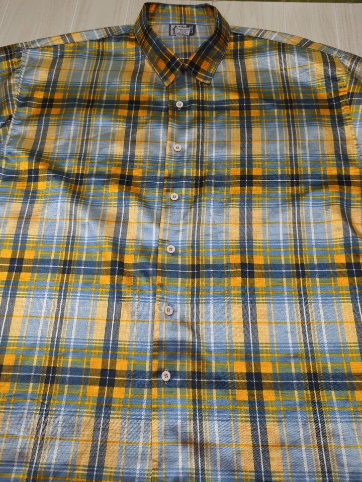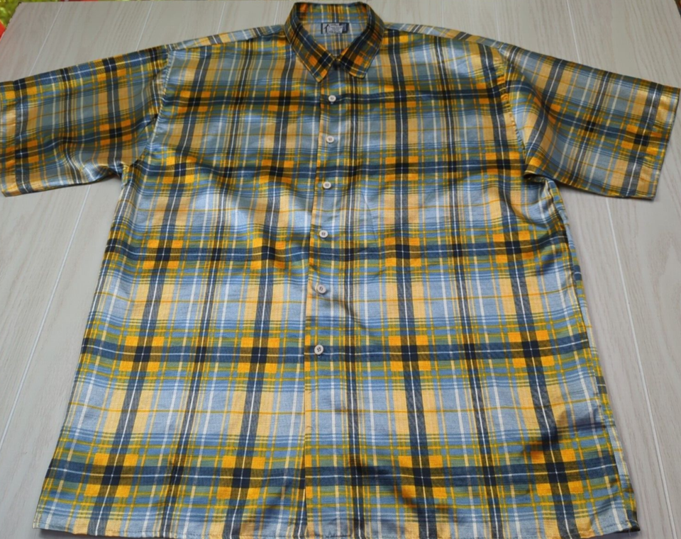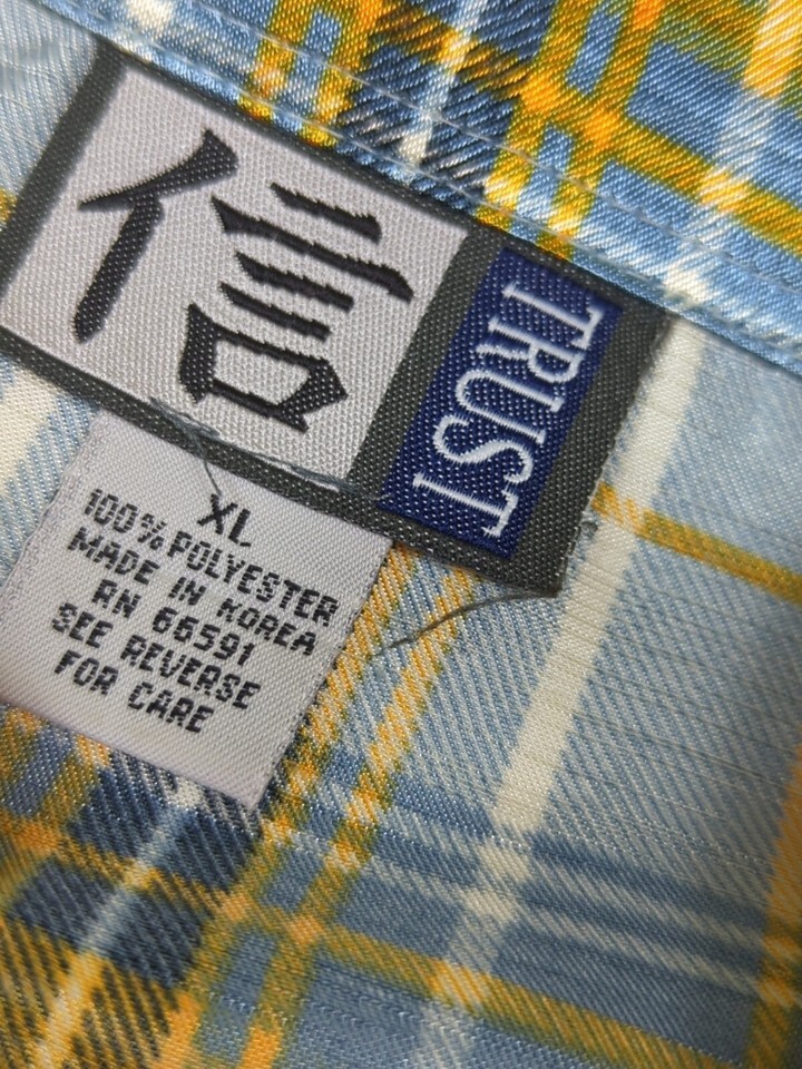 Trust Made Korea vintage men's XL blue yellow plaid Button front Shirt polyester